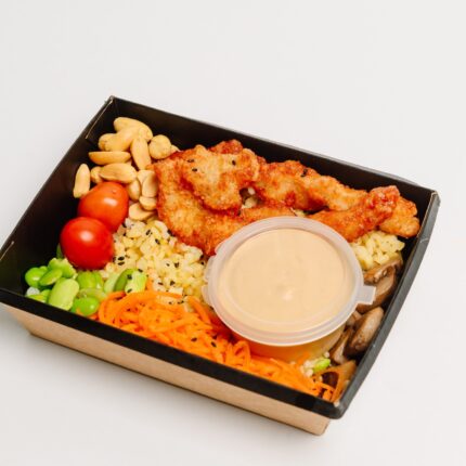 Жаркын жана өзгөчө тамак: өз-өзүнчө тизилген жашылчалар жана панировкадагы тооктун төш эти