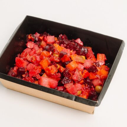 Маринаддалган жашылчалар менен бышырылган кызылча, сабиз жана картошкадан жасалган закуска салаты
