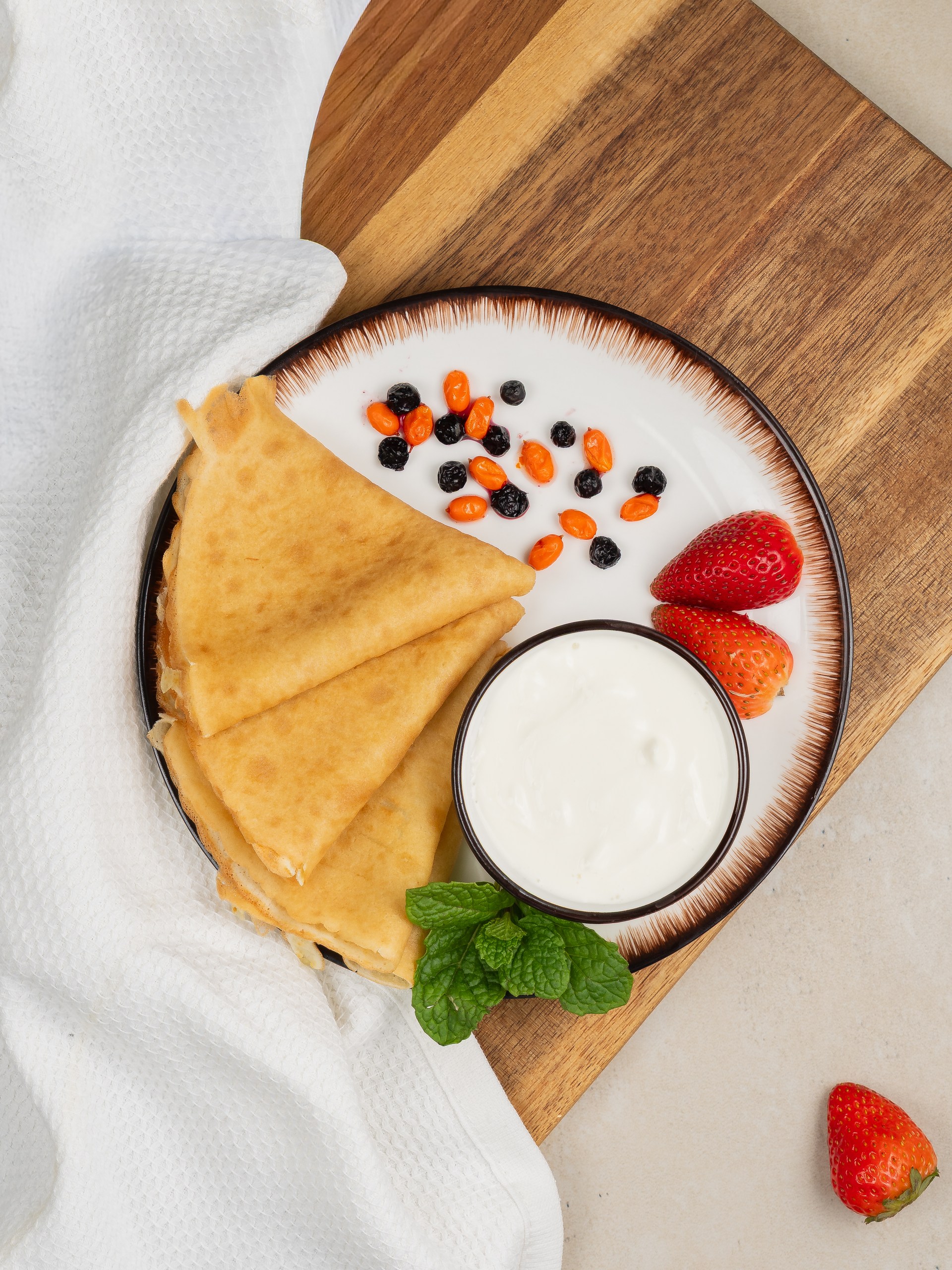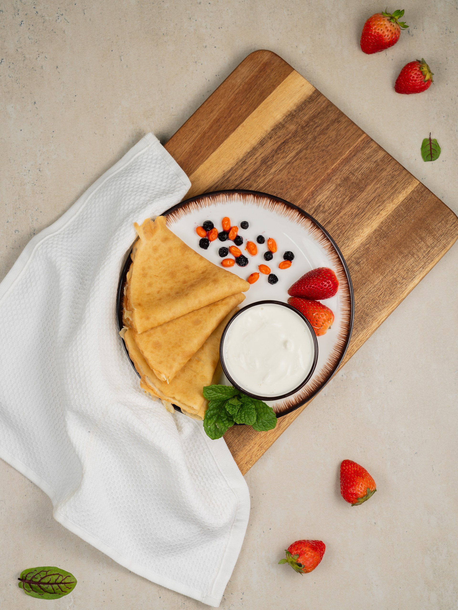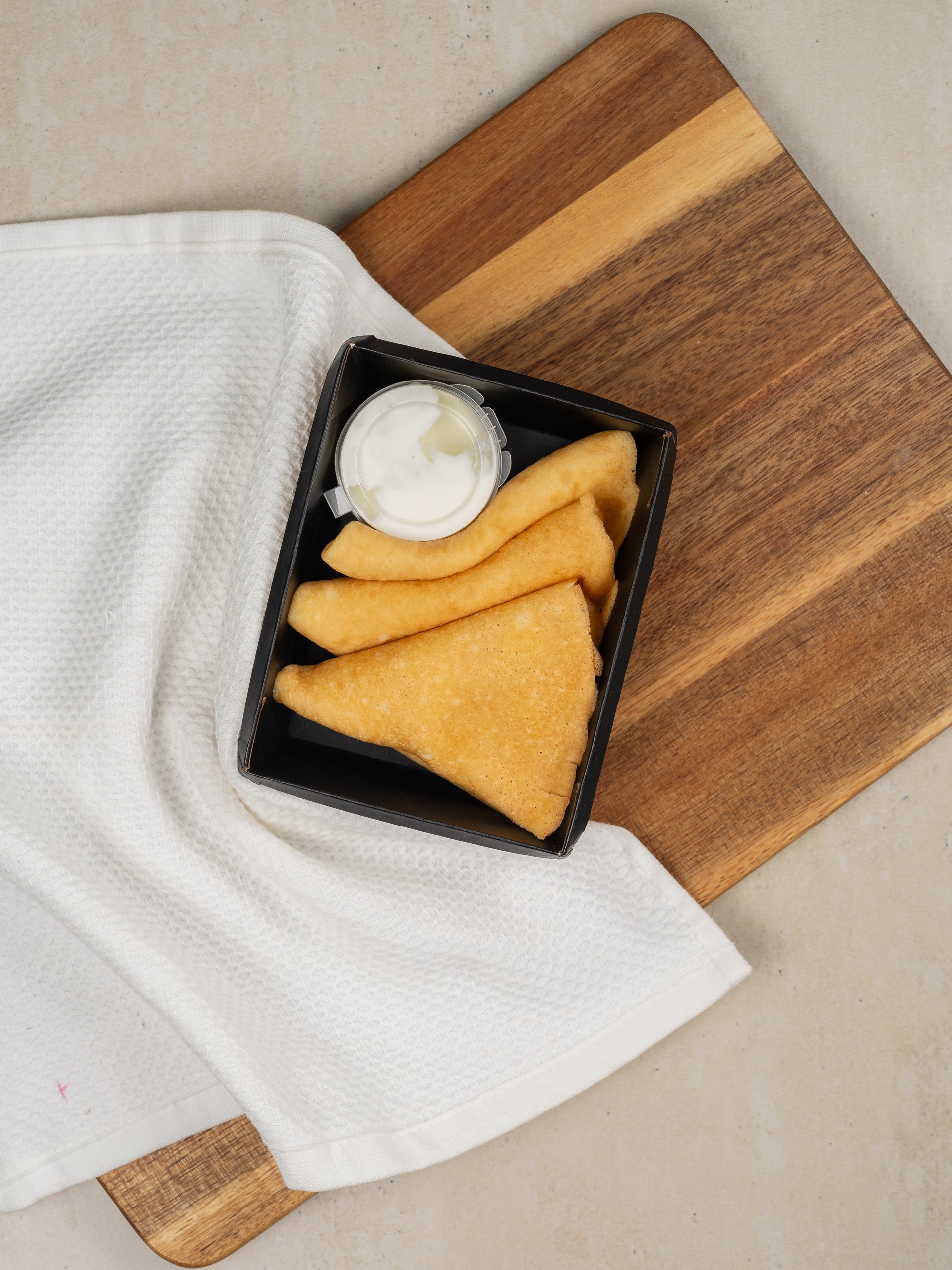 Состав:Тесто (мука пшеничная в/с, вода, молоко 2,5%, яйца куриные, сахар, соль, масло подсолнечное), сметана.