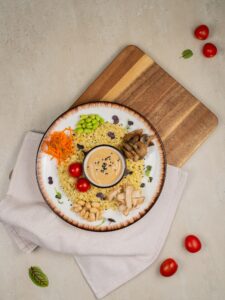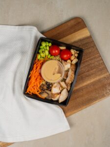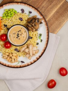 Состав: булгур, куриное филе в тайском стиле (куриное филе, томатная паста, тростниковый сахар, кунжутное масло, соль, уксус, крахмал, перец чили), соус (67% майонез, соус терияки, кунжутный соус, кунжутное масло), помидоры черри, жареные шампиньоны (шампиньоны, соевый соус, подсолнечное масло), свежая морковь, соевые бобы эдамаме, арахис, кунжут.