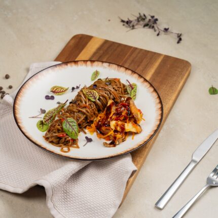Гречневая лапша соба с кусочками куриной грудки и сельдереем, обжаренные в соевом соусе