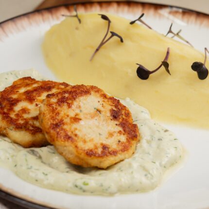Большая порция: рубленные котлетки из куриного филе с гарниром из пюре