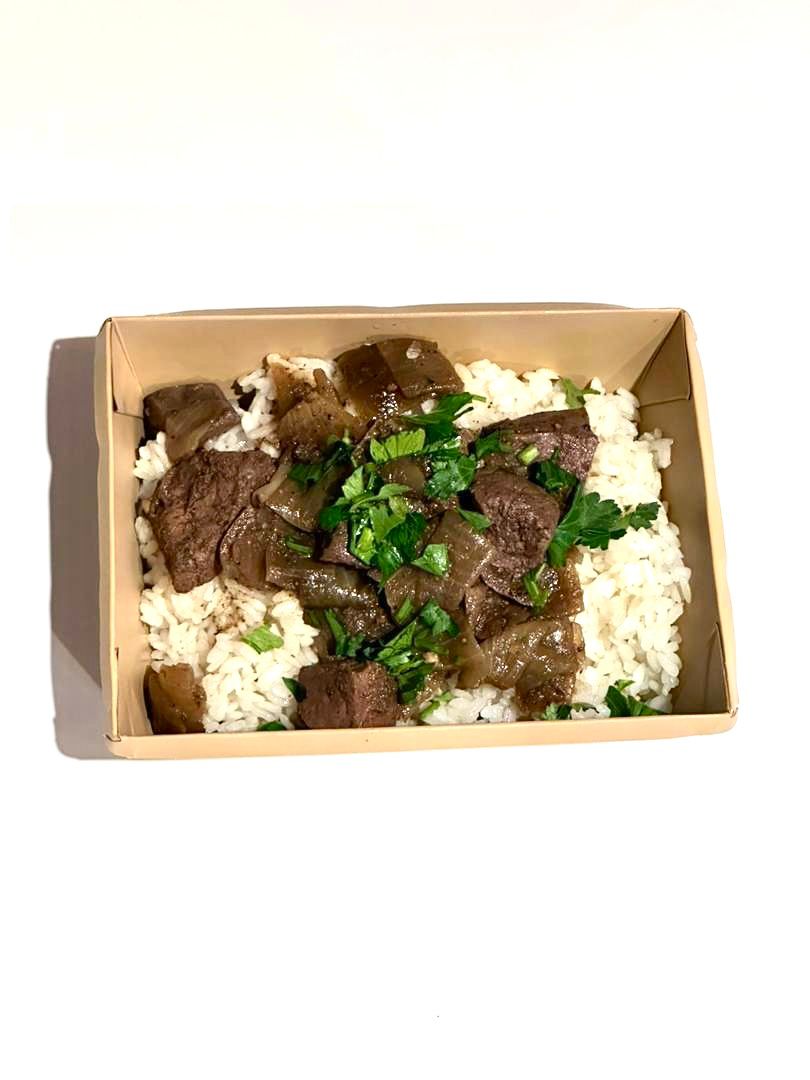 Состав: Говяжья печень тушёная (говяжья печень, лук репчатый, растительное масло, соус лимонный, перец чёрный молотый, соль), рис длиннозёрный (рис длиннозёрный, вода, соль, растительное масло)
