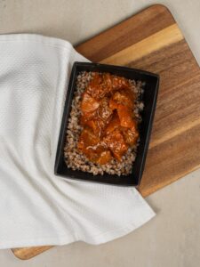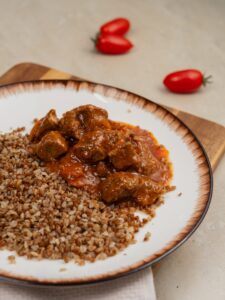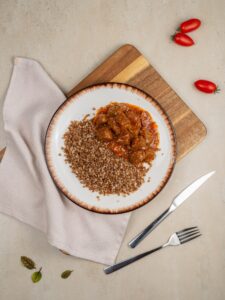 Состав: говядина, гречка, морковь, лук репчатый, томатная паста, подсолнечное масло, вода, соль, сахар, чёрный молотый перец, мука в/с.