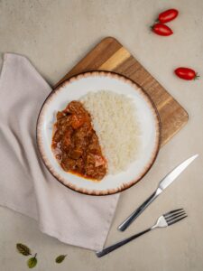 Состав: говядина, рис аль-дэнте, морковь, лук репчатый, томатная паста, подсолнечное масло, вода, соль, сахар, черный молотый перец, итальянские травы, мука в/с.