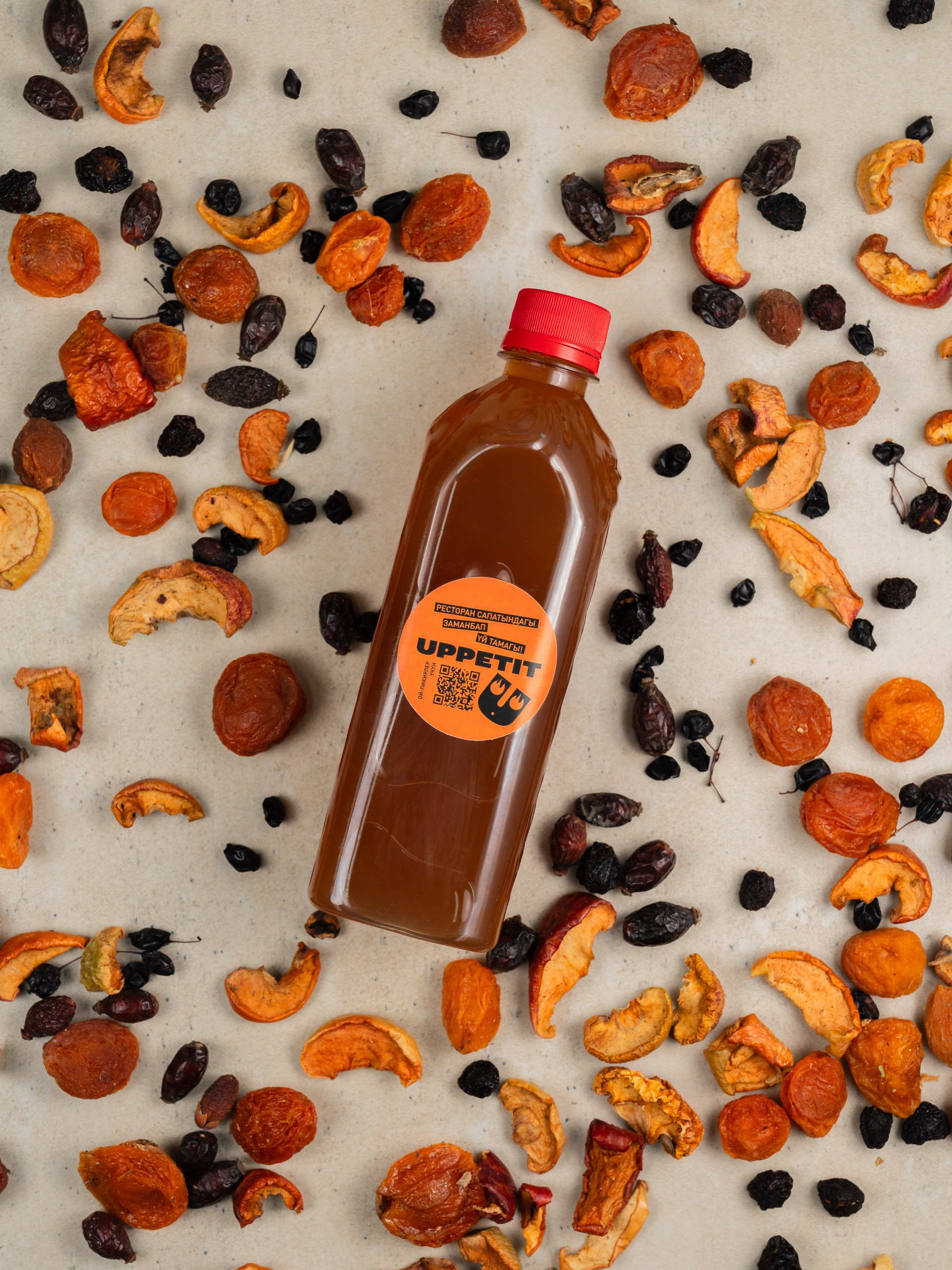 Состав: вода, смесь сухофруктов (яблоки, груши, абрикосы), шиповник, чернослив, сахар.