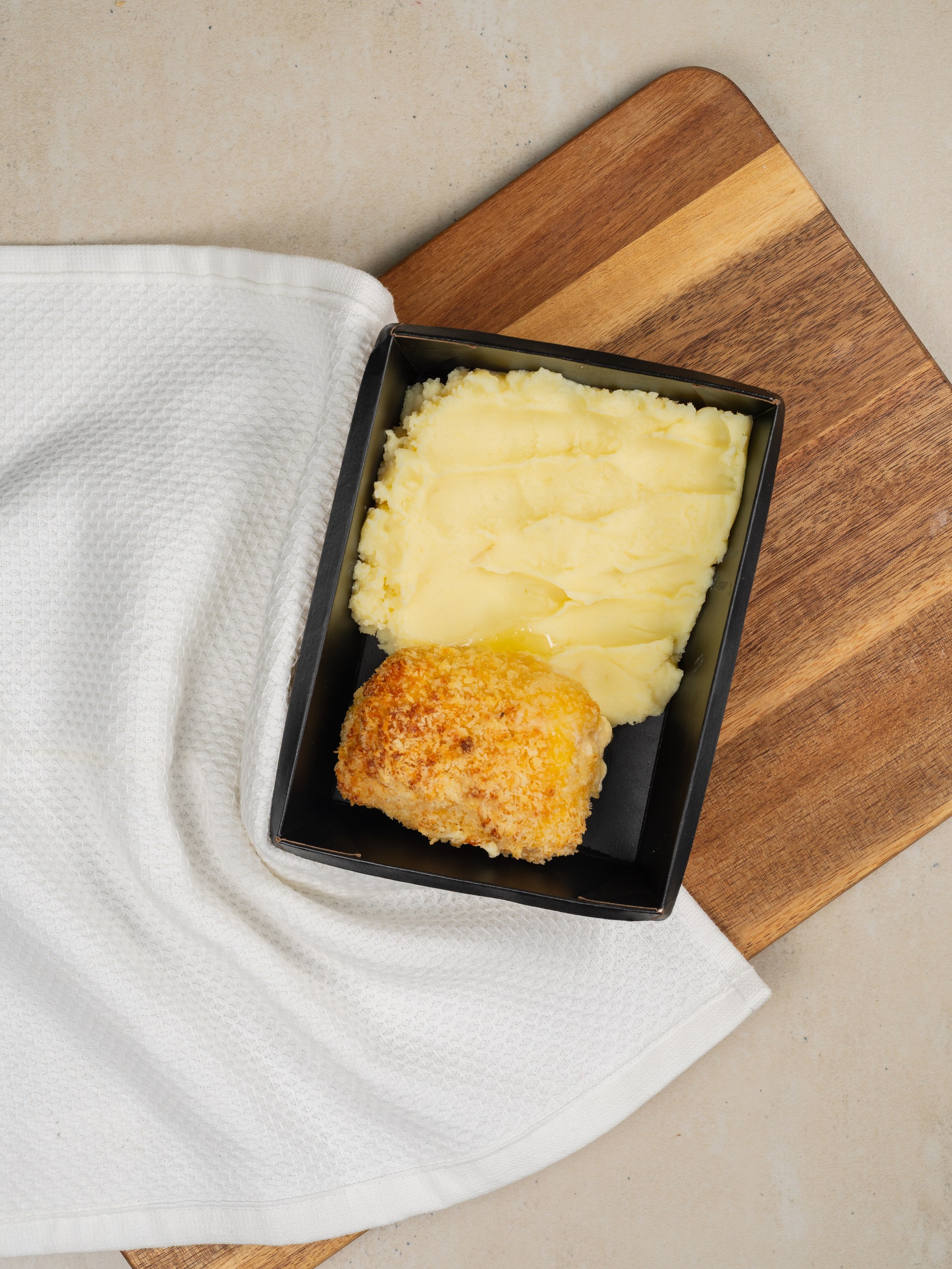 Состав: охлажденное куриное мясо, яичный меланж, жирная внутренняя начинка (82,5% сливочное масло, плавленый сыр, укроп, свежий чеснок, соль), панко сухари, подсолнечное масло, пшеничная мука в/с, картофельное пюре (картофель, молоко 2,5%, вода, сливочное масло 82,5%, сухое молоко, соль).