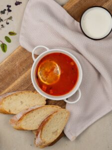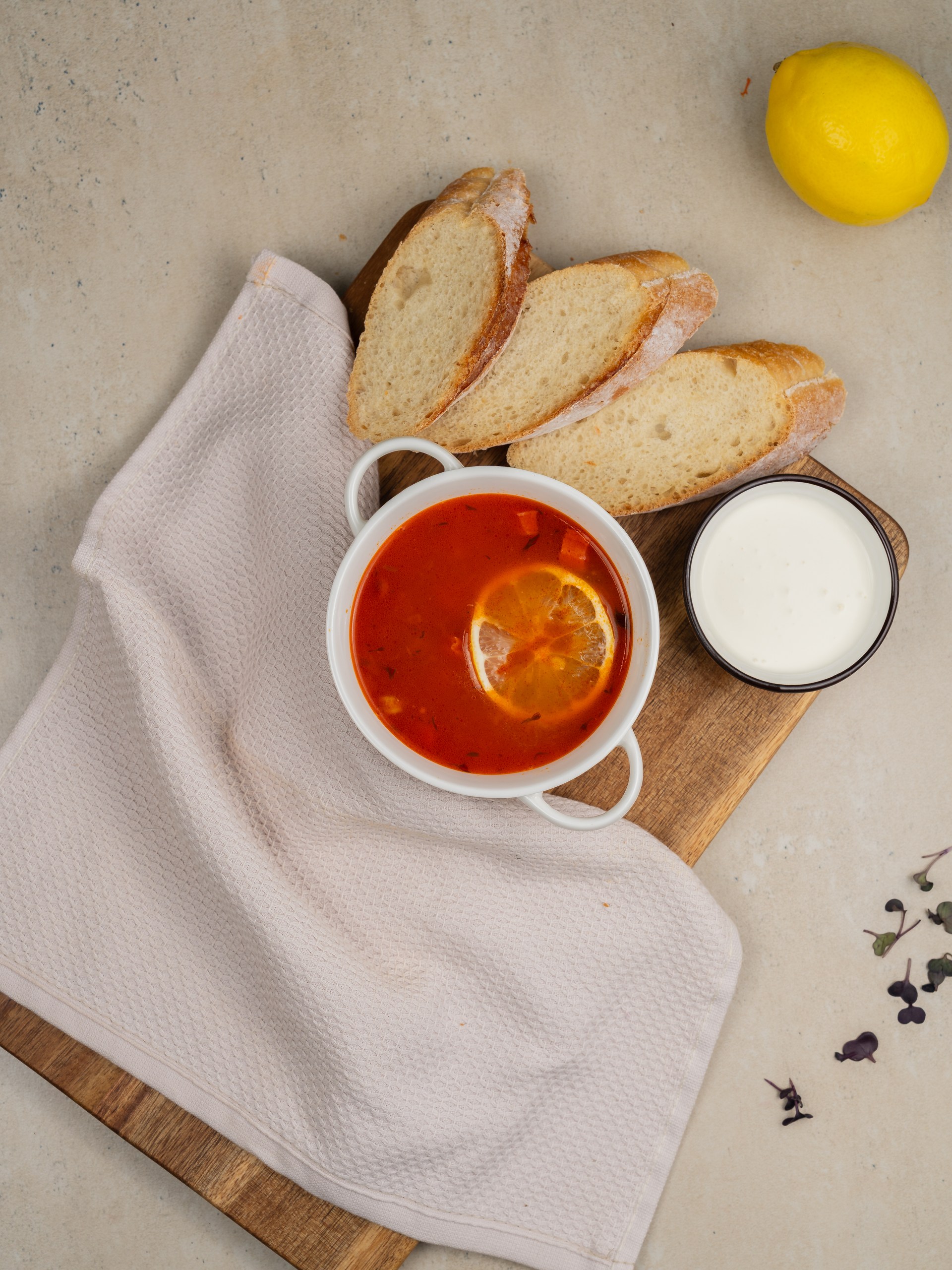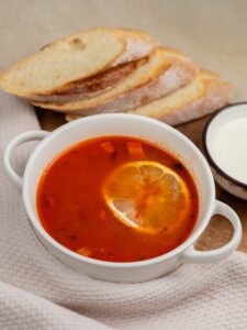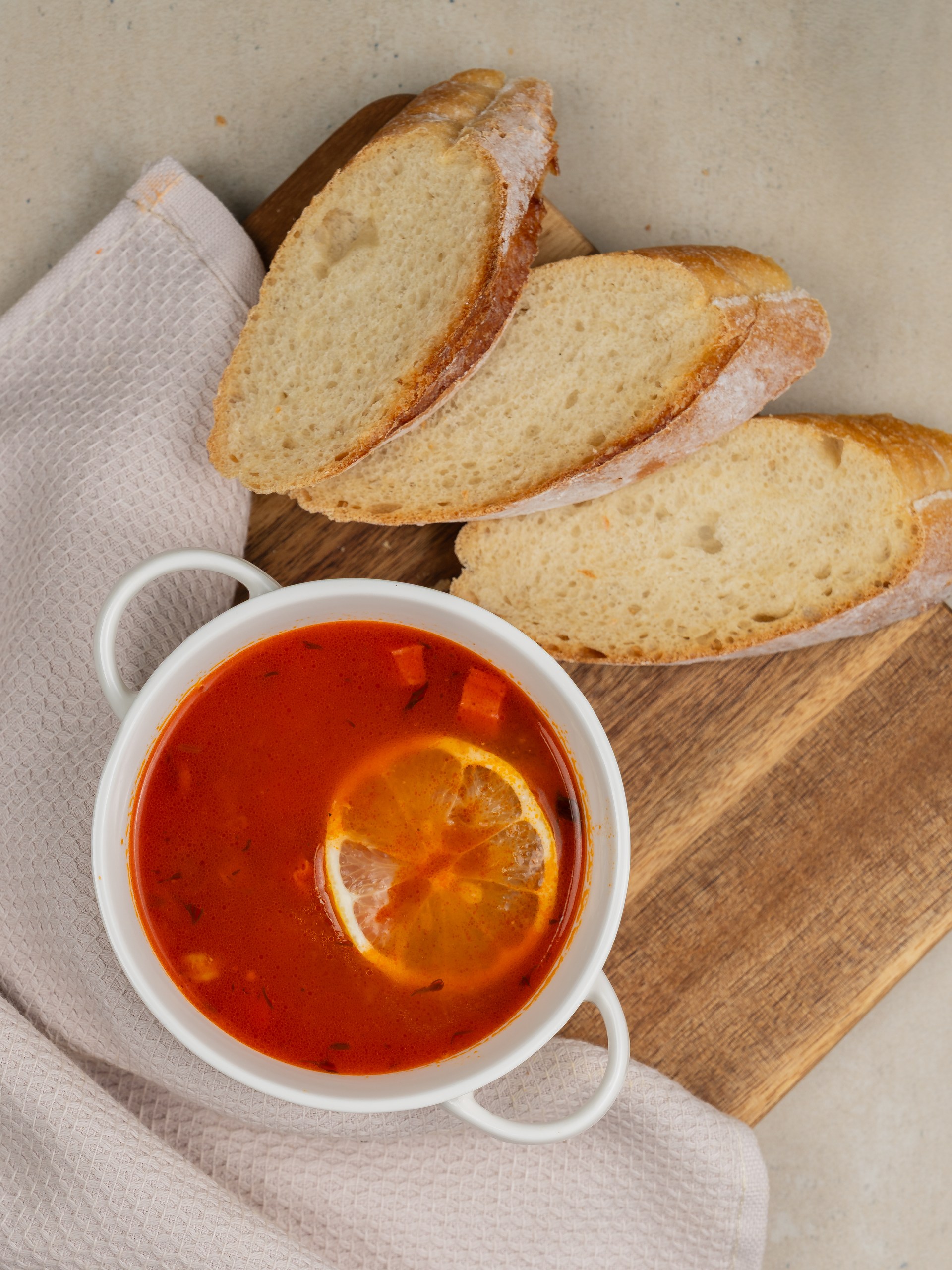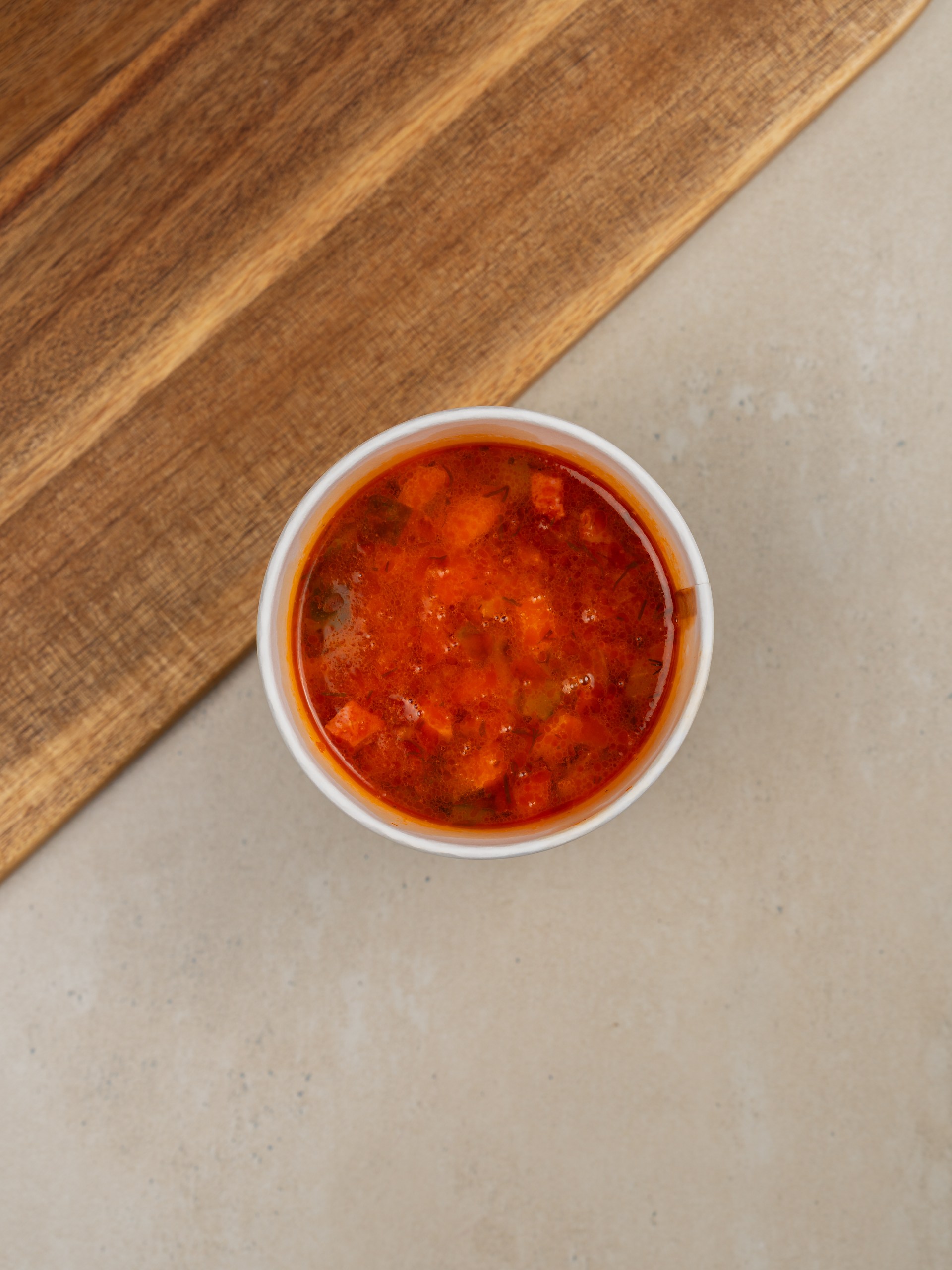 Состав: копчёная колбаса, копчёная окорочка, докторская колбаса, солёные огурцы, репчатый лук, морковь, чёрные оливки, зелёные оливки, соль, приправа «Вегетта», укроп, чеснок, жидкий дым, томатная паста, чёрный молотый перец. Бульон куриный (суповой набор, морковь, репчатый лук, перец, горошек, вода). Сметана 20%.