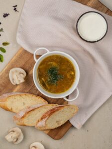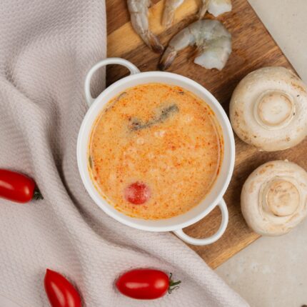 Состав: Бульон куриный (куриный суповой набор, морковь свежая, лук репчатый, перец чёрный горошек, вода), шампиньоны, морковь красная, лук репчатый, филе куриной грудки, масло подсолнечное, соль, перец чёрный молотый.