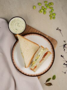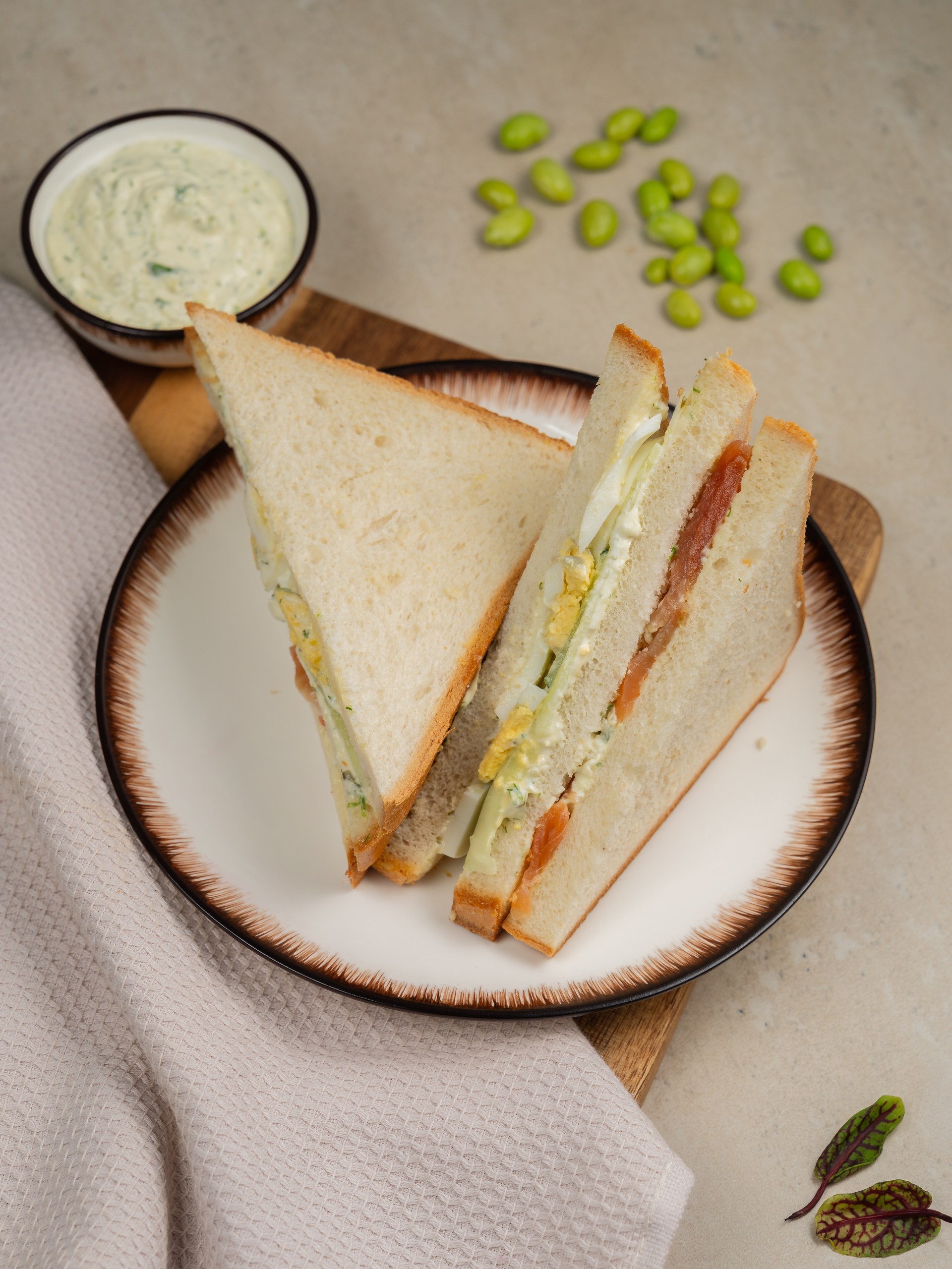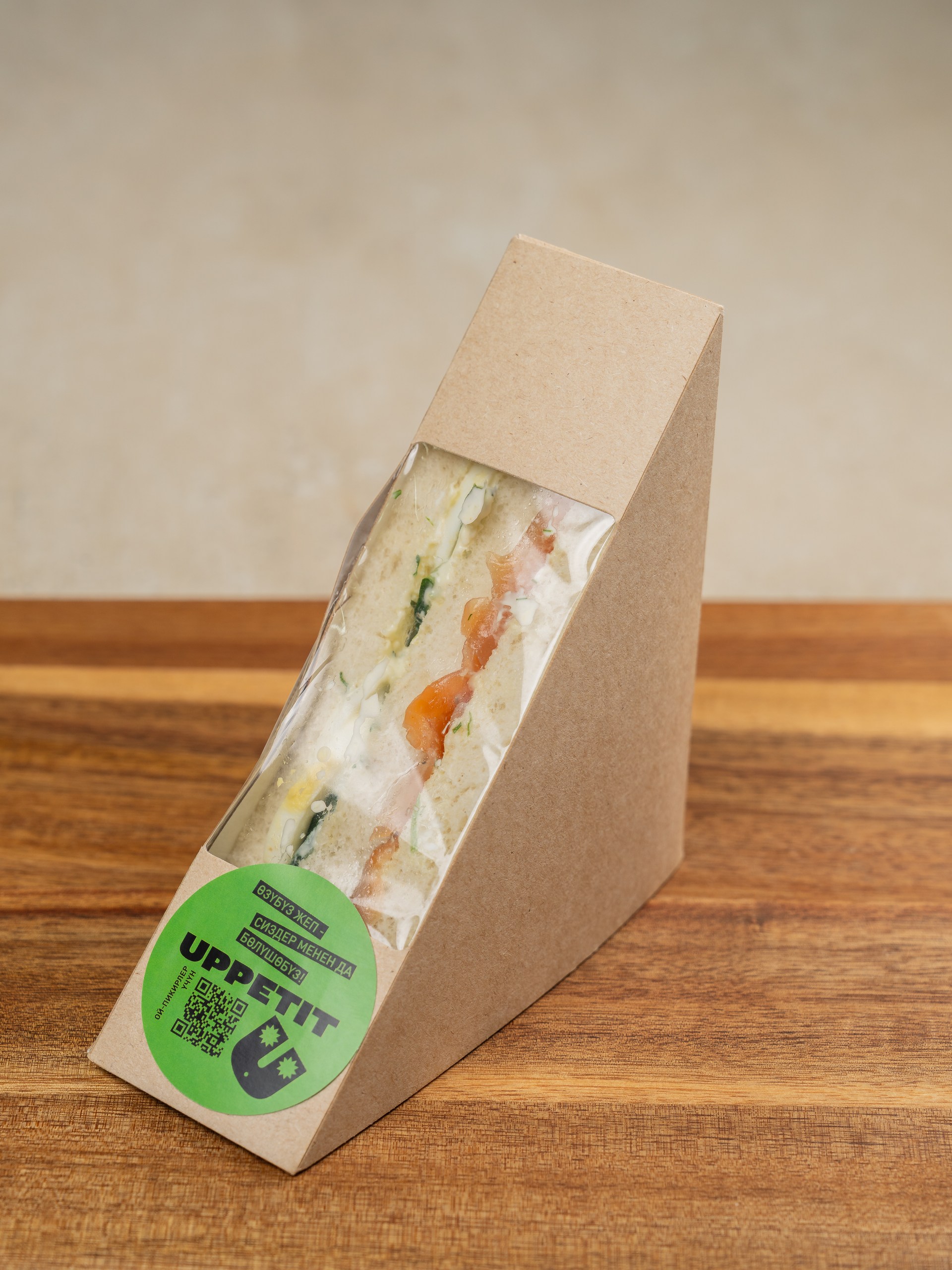 Состав: Тостовый хлеб (пшеничный), тар-тар соус (майонез 67%, варёное куриное яйцо, солёный огурец, укроп, приправа «Паприка», лимонный сок, сахар, соль), варёное куриное яйцо, солёная/полусолёная форель, свежий огурец.